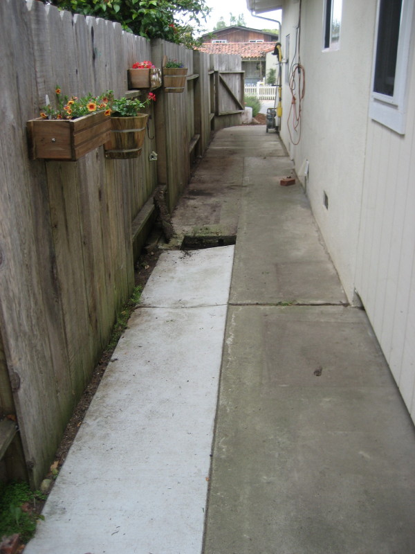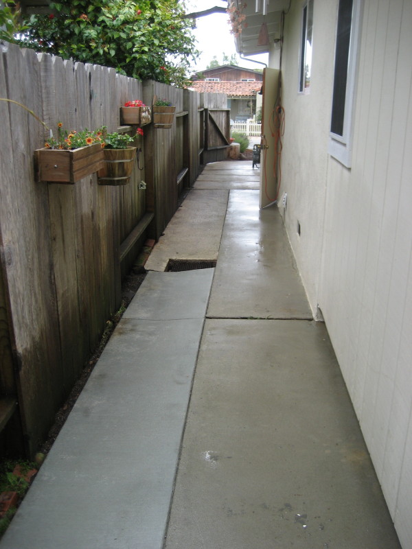 After all these years, I have to give a shout out to all the Santa Cruz County residents/clients that decided it was time to clean up and fully utilize their Concrete Side Yards. What is a Concrete Side Yard? It is either one side, or both sides of your house(usually just one) that houses(pun) your three trash cans, BBQ’s, gardening junk, rusty ten speeds, opened up potting soil, surf and boogie boards, and a ton of other crap. The concrete is usually pretty dank because it gets limited sun, and is disgusting because it never gets any love. I have more to say about Concrete Side Yards, but I’ll save it for a rainy day…..