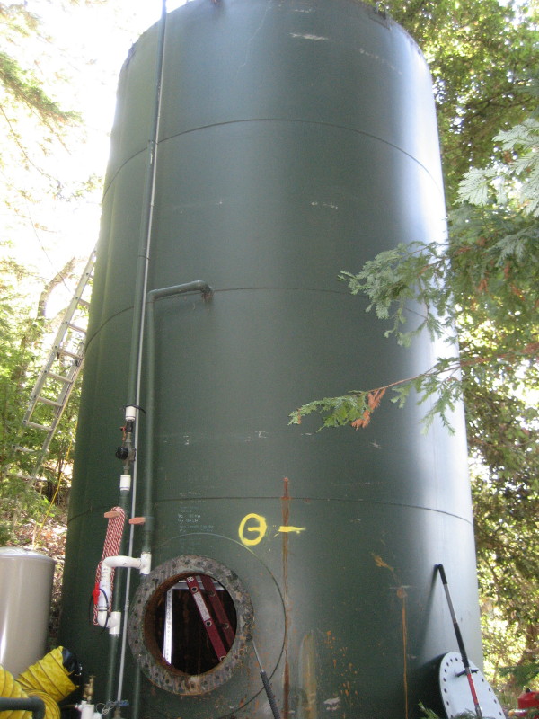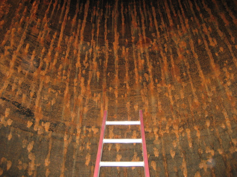 This tank was I believe 20 feet high and maybe 12 feet in diameter. As you can see it was riddled in a wet rust of sorts. The idea behind this ugly, ugly job was to remove all the rust so that the entire inside could be re-epoxied and made to be new again. Before any new epoxy could be applied, ALL the bb-sized holes needed to be filled after the cleaning. You can see from the outside shots of the tank that rust was already making its way to the outside of the metal. It was only natural that many “soft” spots in the metal were opened up with my 3500 PSI Turbo Nossle. A perfect example of a surface that desperately needed to be properly cleaned before the application of a particular material.