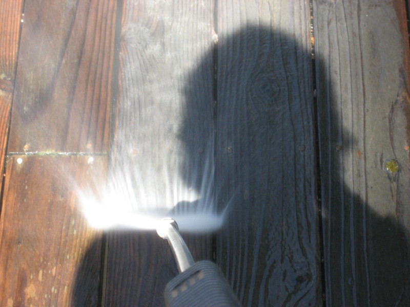I love this action photo because it shows 4 GPM and 900 lbs. of water pressure fitting perfectly in between slimey 2×6 wood boards. I was testing out a new tip(on my favorite bent wand) and my new camera all at once. It was much tougher to pull off than walking and chewing gum..I’ll say that. I was just having some fun on my own back deck….