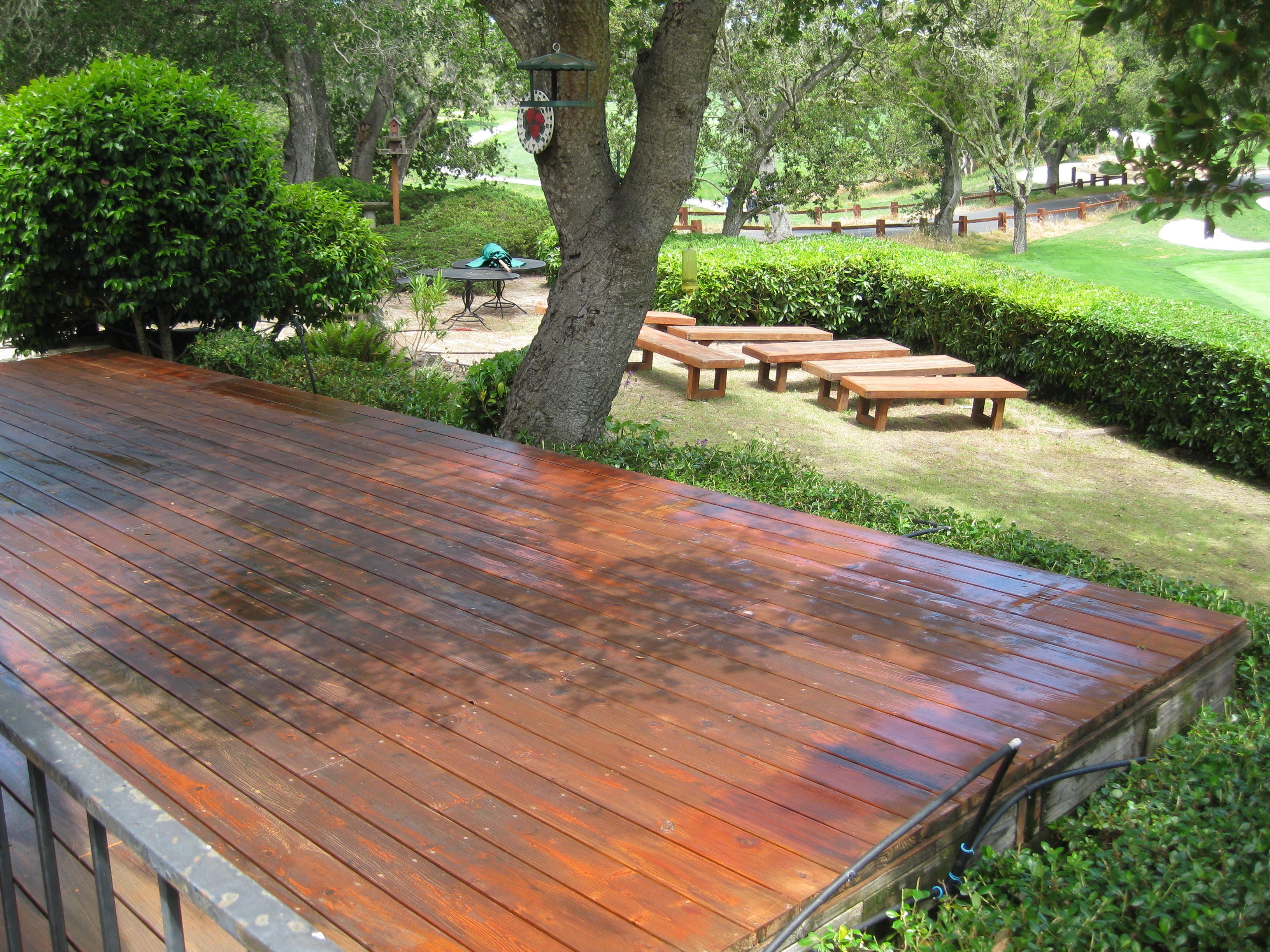 The drying time of any wood deck that has been freshly stained depends on a number of factors. These factors, combined with the method by which the stain is applied, will ultimately determine when the boards are dry. We typically tell our clients to stay off the deck for 24 hours, yet if the deck gets a strong shot of direct sun…it’s pretty good to go within a few hours. Here’s a freshly stained deck on the Pasatiempo Golf Course. Notice the decks’benches in the foreground waiting their turn at some LOVE.