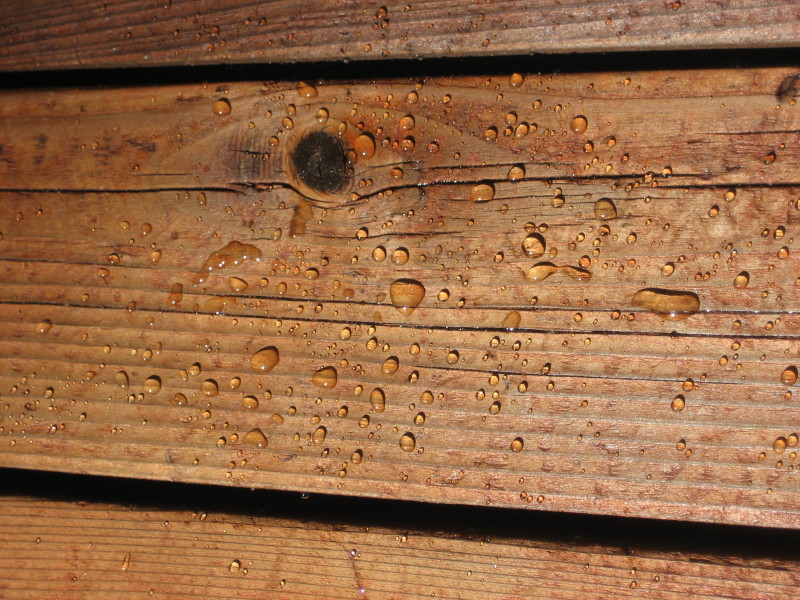The reason that water is beading on these very old wood boards is because this is a fresh coat of stain.