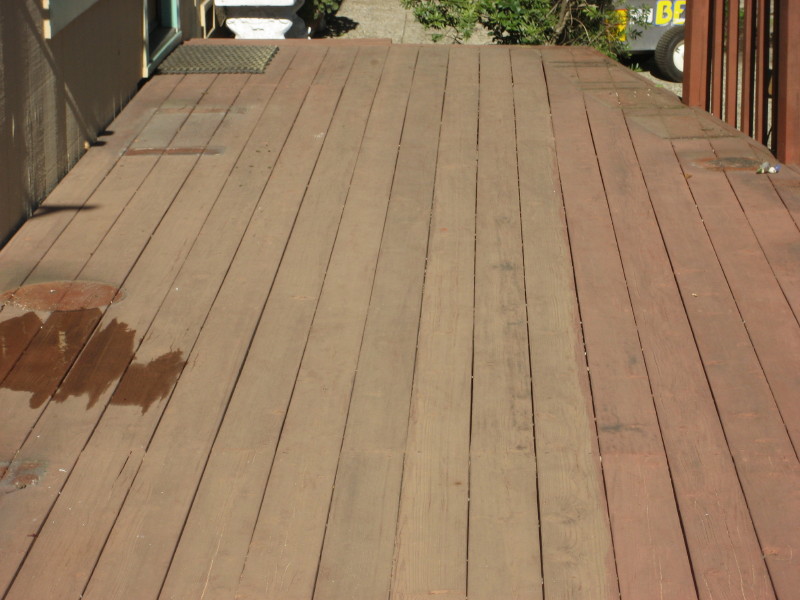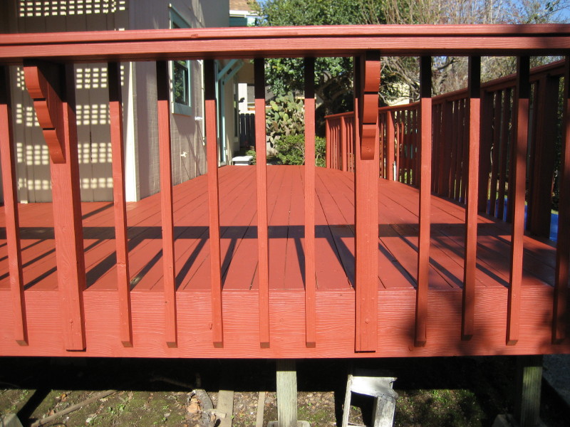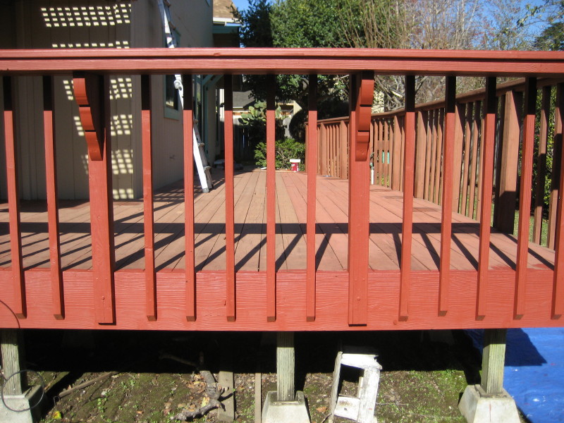 …when the deck looks somewhat like this. Stripping existing materials is time consuming and environmentally disruptive. Although a quality transparent stain is usually the material of choice, if the deck has an existing solid stain or paint on it already, the most cost effective and environmentally sound approach is to wash and re-apply a “water-based” solid color decking stain. This particular run-down, two-tone deck on the upper West-Side of SC was in desperate need of a face lift before being put on the market for sale. Mas mejor!