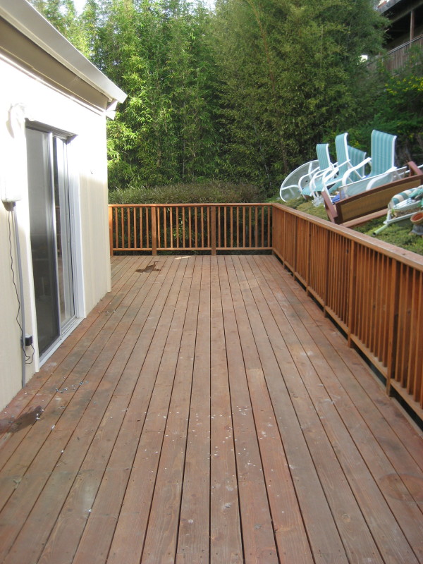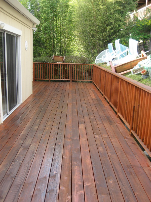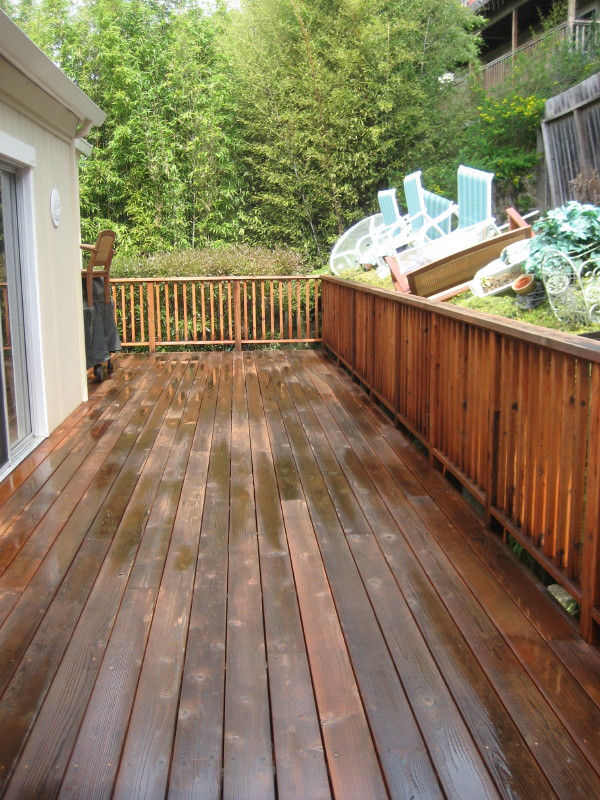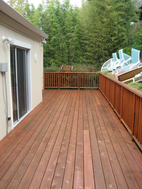 I like this series of pictures because it shows something that is very, very important!! The picture on the far left is obviously a “before shot”. However…had I not washed and stained this very deck two years prior, the before shot would look much, much different than it does here. The boards would most likely be heavily greyed in color taking on a very weathered look. Instead, albeit dirty and riddled with bird shit, they aren’t grey or weathered whatsoever which really says alot about this quality staining job. The rest of the pictures in this series kind of speak for themselves. It’s rare that I get a fully cured “after shot”. Nice color huh?