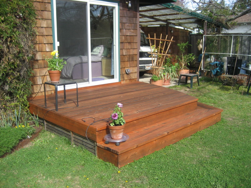 As it stands now, I have stained this deck just 2x, the first time being April 2007. I believe the deck was built in the fall of 2006. I advised the client to wait until spring to wash and stain for the first time. I don’t have pictures from that day, but here is how it looks in April 2008 after a quick stain job. My next bit of advice for this sweet lady in Aptos was to call me again in October and I will throw another coat of Biowash Natural Oil on it for $50. The key to brand new decks is to let them age a bit before showering them with love. It’s all about the love!!