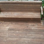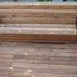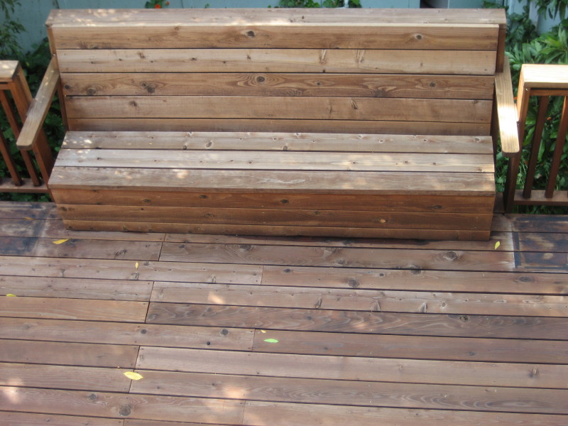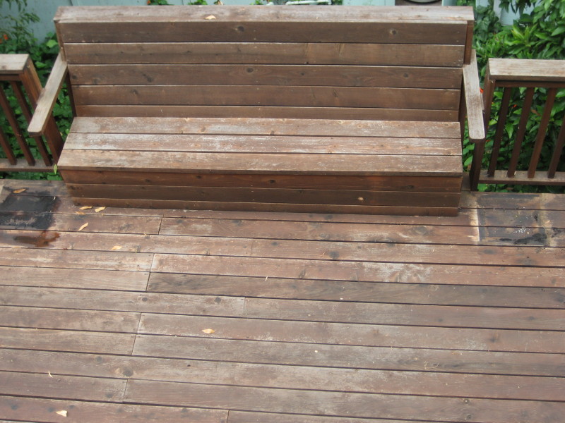The moral to the story is to keep things UP off the deck, AND also move things around from time to time…especially big potted plants that get watered often. As you can see from the square marks on each side of the foot of this bench, this was a potential disaster waiting to happen to this beautiful deck. Luckily it was caught in time. I suggested putting their boxed lemon trees on sturdy rollers, and for a year or so..moving them to a different place on the deck.